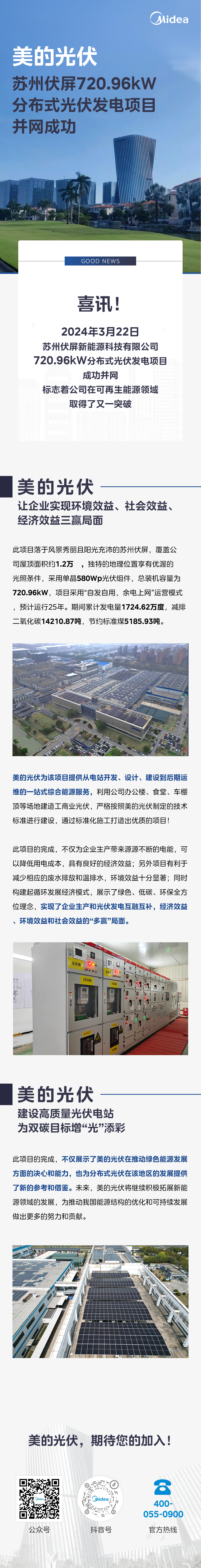 美的光伏蘇州伏屏720.96kW分布式光伏發(fā)電項目并網(wǎng)成功